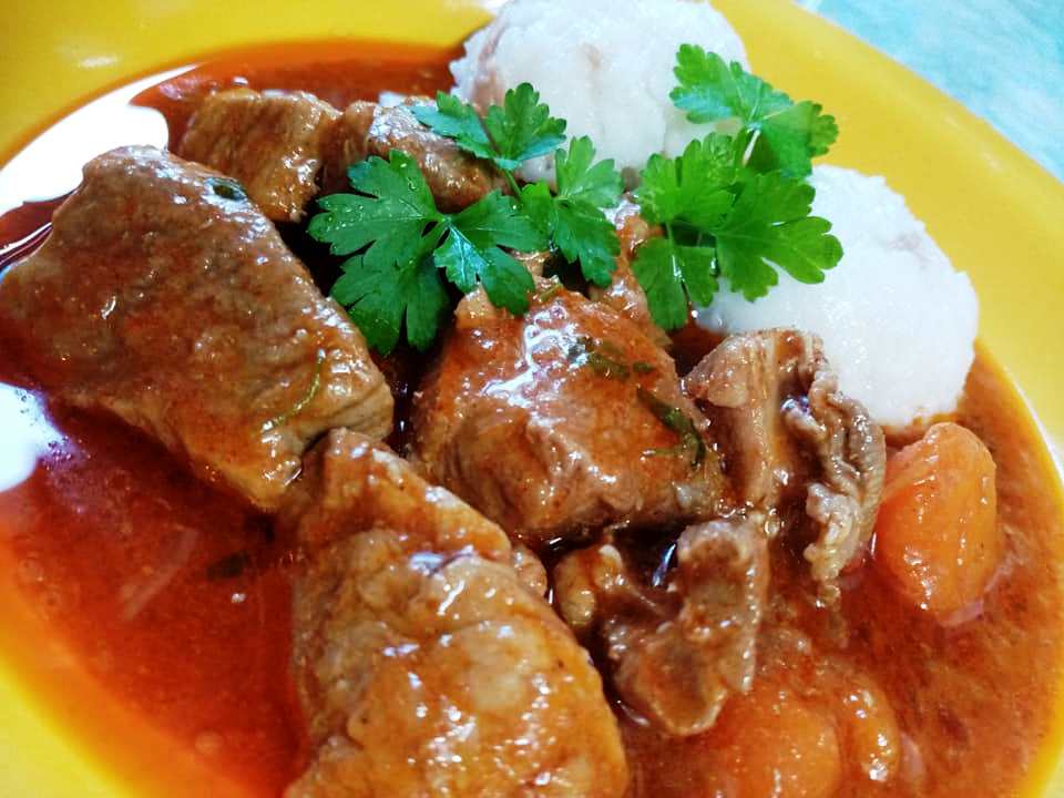 Επιστρέψτε το κρέας, προσθέστε τις ντομάτες, το αλεύρι, την κόκκινη πιπεριά, τα μπαχαρικά και πολτοποιήστε τις σκελίδες σκόρδου από πάνω. Ανακατεύουμε καλά και προσθέτουμε νερό έτσι ώστε να καλύπτει ένα δάχτυλο από πάνω. Προσθέστε αλάτι για γεύση. Βράζουμε για περίπου 30-40 λεπτά σε μέτρια φωτιά. Μόλις μαλακώσει το κρέας, το αποσύρουμε από τη φωτιά. Σερβίρετε φτιάχνοντας μερικές μπάλες ρύζι (χρησιμοποίησα ένα κουτάλι παγωτό,