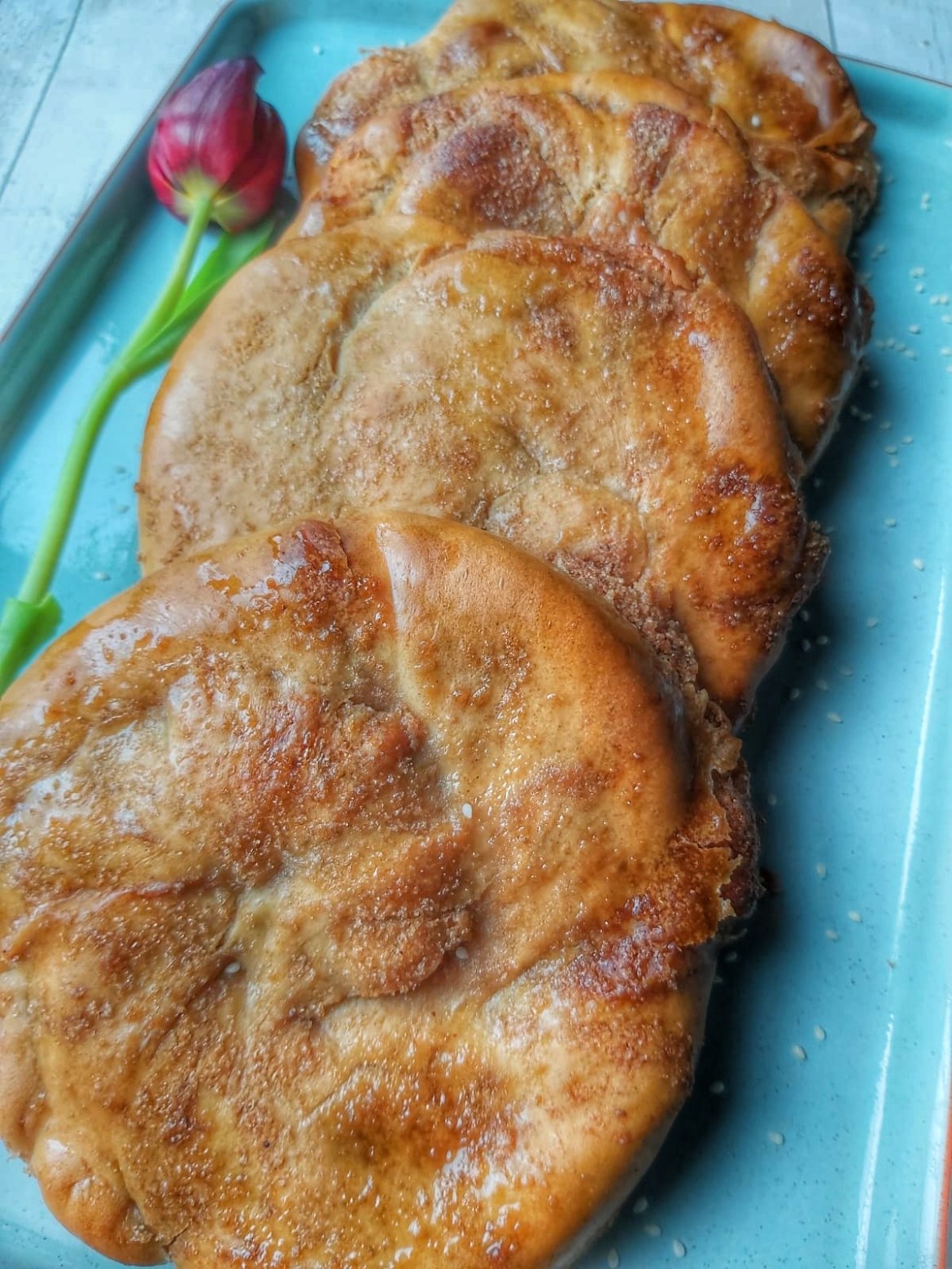 Βήμα 4 Διαχωρίστε τη ζύμη σε 6 ίσα κομμάτια. Χρησιμοποιώντας έναν πλάστη, ανοίξτε το πρώτο κομμάτι όσο πιο λεπτό γίνεται. Προσθέστε δύο κουταλιές της σούπας και κλειστε το ξανά, όπως ένα ρολό. Πιάστε τα δύο άκρα και τα τυλίξτε προς τα μέσα προς την αντίθετη κατεύθυνση και δημιουργήστε μια σπείρα. Χρησιμοποιώντας και πάλι τον πλαστη κάντε το επιπεδο. Επαναλάβετε με τα υπόλοιπα και τοποθετήστε τα σε ένα ταψί στρωμένο με χαρτί ψησίματος. Αφήστε να ξεκουραστούν και να φουσκώσουν λίγο για 10-15 λεπτά.