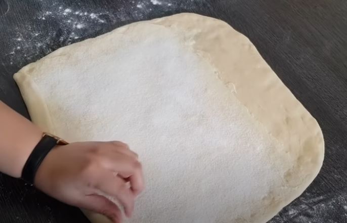 Αρχίζουμε να τυλίγουμε την ζύμη σε ρολό και ξεκινώντας από την άκρη που έχει ζαχαρη και τελειώνουμε στην πάνω ακρη που ραντίσαμε με νερό όπου και σφραγίζουμε την ζύμη.