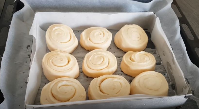 και τοποθετούμε τα κομμάτια σε ταψάκι που είναι βουτυρωμένο στην βάση και στρωμένο παντού με χαρτί ψησίματος, τα ψεκάζουμε με νερό και τα σκεπάζουμε για 45 λεπτά.