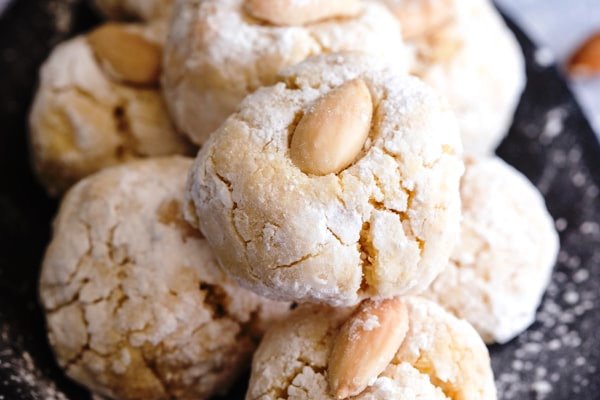 Προσθέστε το αυγό και το χυμό λεμονιού και ανακατέψτε μέχρι να μείνει το μείγμα. Στη συνέχεια,σχηματίστε περίπου 14 μπάλες (περίπου το μέγεθος των μπαλών του γκολφ). Στη συνέχεια σχηματίστε σε περίπου 14 μπάλες (περίπου το μέγεθος των μπαλών του γκολφ). Τυλίξτε σε ζάχαρη άχνη και τοποθετήστε το στο έτοιμο ταψί. Τοποθετήστε στην μέση ένα αμύγδαλο πιέζοντας προς τα κάτω (ελαφρώς μην ισιώσετε το μπισκότο) στο πάνω μέρος κάθε μπάλας. Ψήστε για περίπου 15 λεπτά.