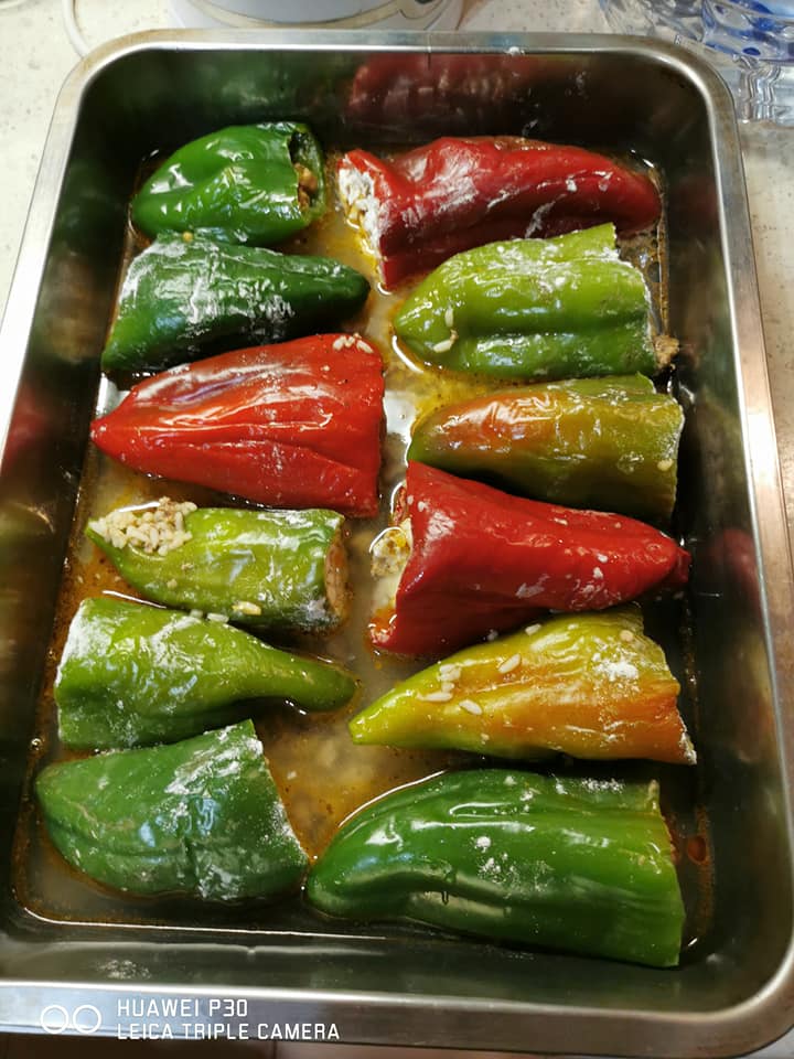 βάζουμε ενάμιση ποτήρι νερό και σκεπάζουμε με αλουμινόχαρτο. Τοποθετούμε το ταψί σε προθερμασμένο φούρνο στους 200 βαθμούς. Ψήνουμε μέχρι να μαλακώσουν οι πιπεριές, ελέγχοντας συχνά τη στάθμη του νερού στο ταψί και προσθέτοντας κι άλλες αν χρειάζεται.