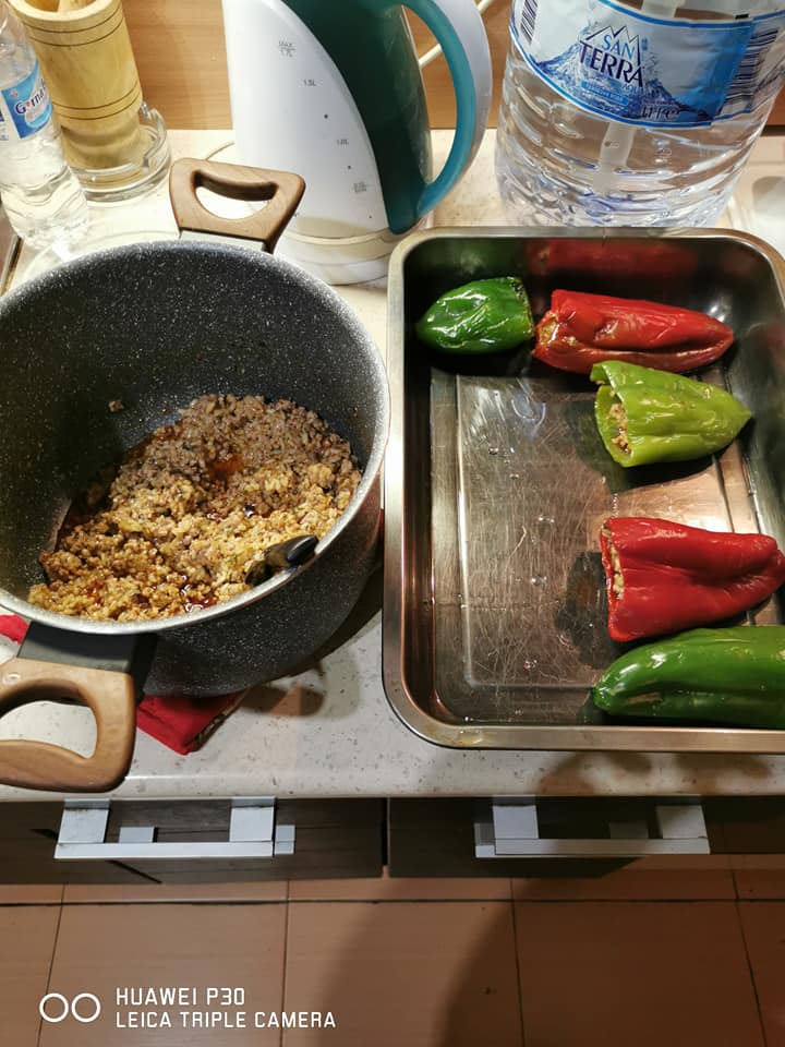 Αφήνουμε στην άκρη την έτοιμη γέμιση για πιπεριές και ετοιμάζουμε τις πιπεριές.
