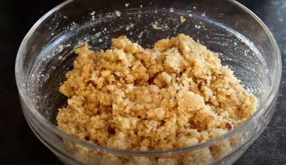 Αδειάζουμε το μείγμα σε ενα μπολ και ρίχνουμε το ροδόνερο και ανακατεύουμε να γίνει μία πάστα.