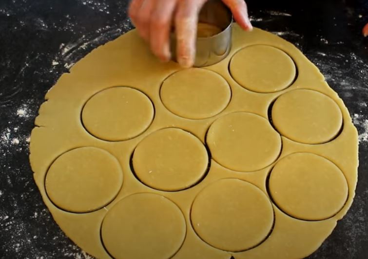Ανοίγουμε την ζύμη σε αλευρωμένη επιφάνεια με τον πλάστη σε πάχος περίπου 1/2 εκατοστού και κόβουμε με μία κουπ 5.5 εκ περίπου.