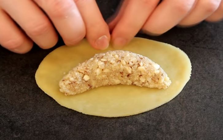 Τοποθετούμε στο κέντρο την γέμιση και την κλείνουμε με το ζυμάρι και της δίνουμε ότι σχήμα θέλουμε.