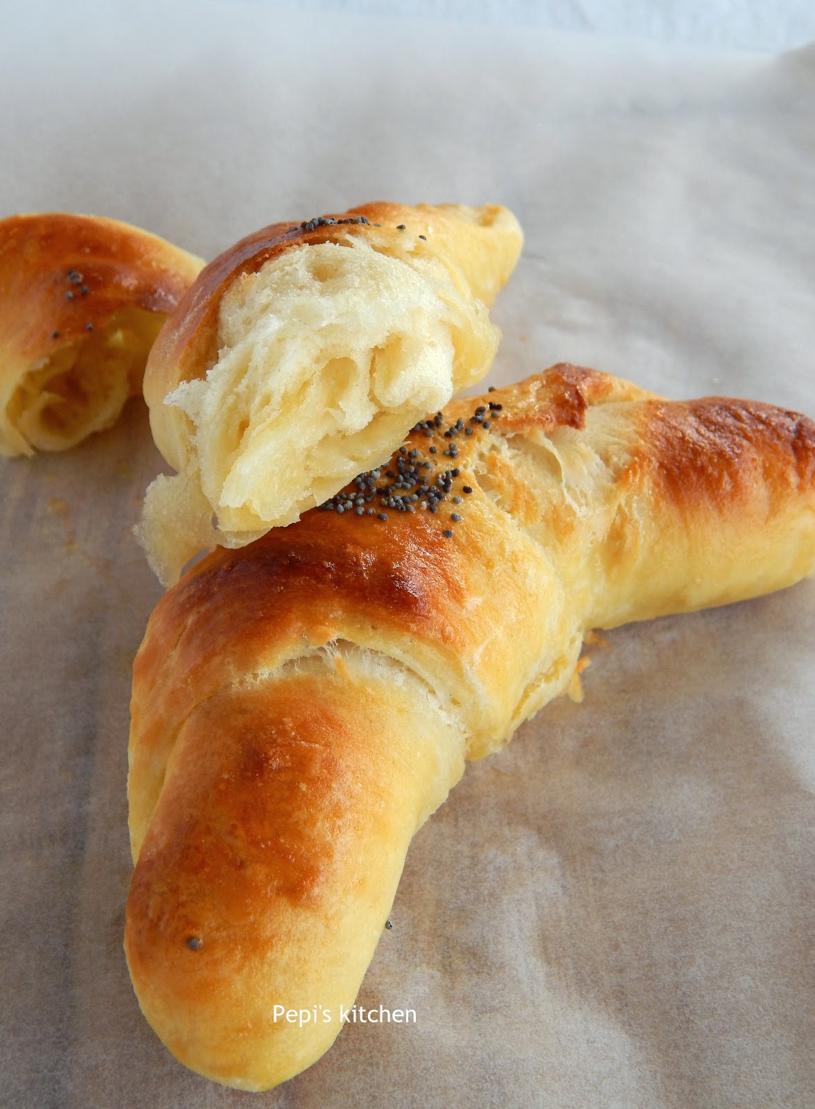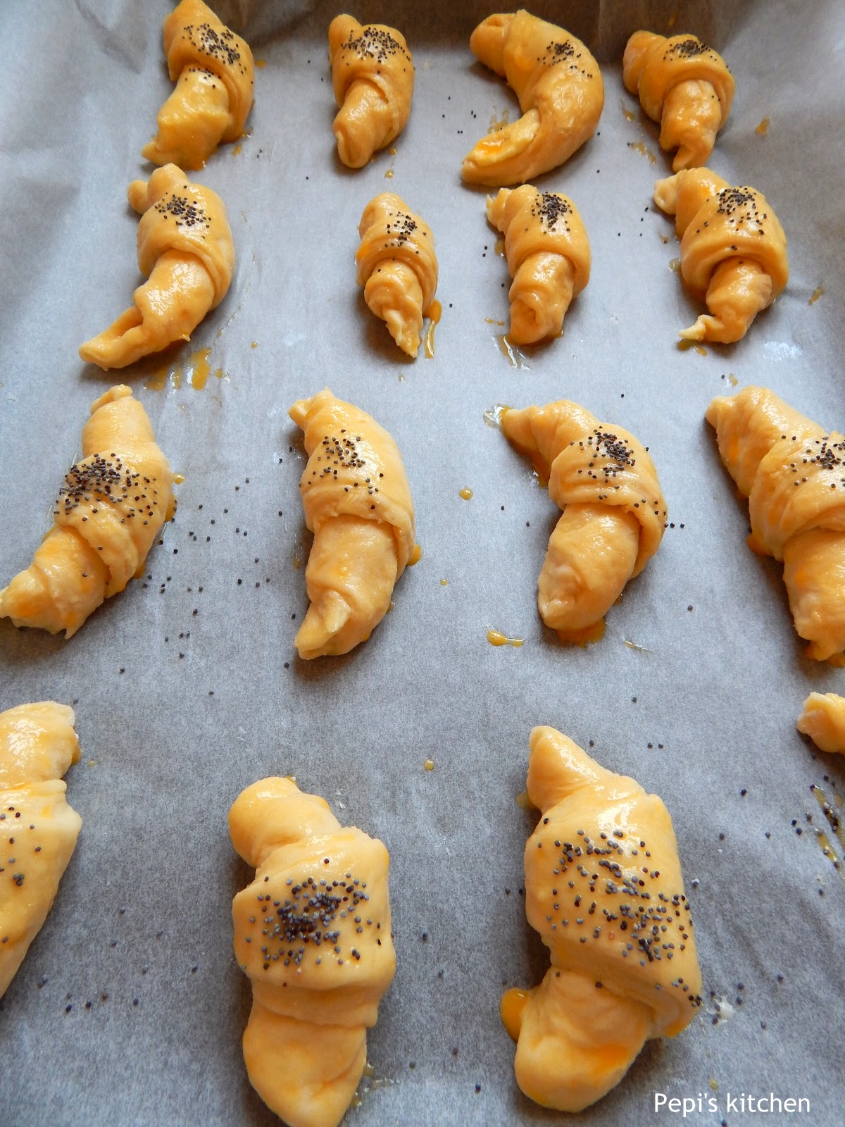 Στρώνετε αντικολλητικό χαρτί στο ταψί και τοποθετείτε τα κρουασάν. Τα αλείφετε με το χτυπημένο αυγό και τα πασπαλίζετε με παπαρουνόσπορο.