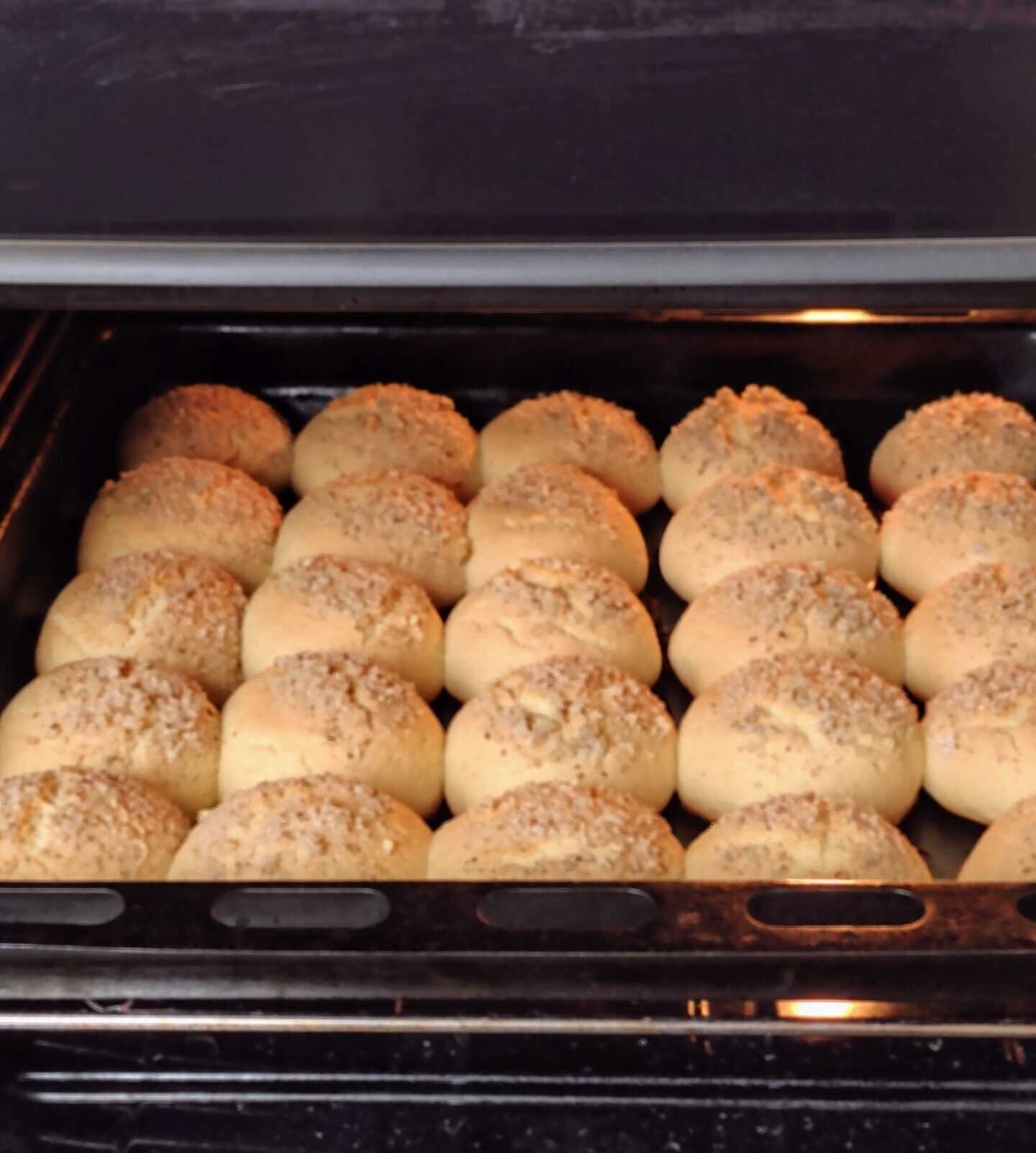 Η γέμιση είναι προαιρετική και για γεύση. Βουτάμε σε ψιλοκομμένα καρύδια με ζάχαρη και ψήνουμε σε προθερμασμένο φούρνο στους 180 γρ σε χαρτί ψησίματος μέχρι να πάρουν ωραίο χρώμα