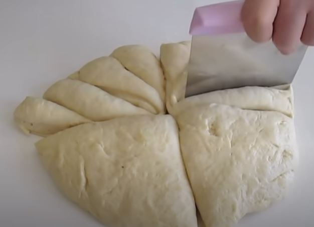 Ρίχνω λίγο αλεύρι στον πάγκο της κουζίνας και αδειάζω τη ζύμη. Ζυμώνω λίγο και την χωρίζω αρχικά σε 4 μέρη και στη συνέχεια σε 16 μέρη.