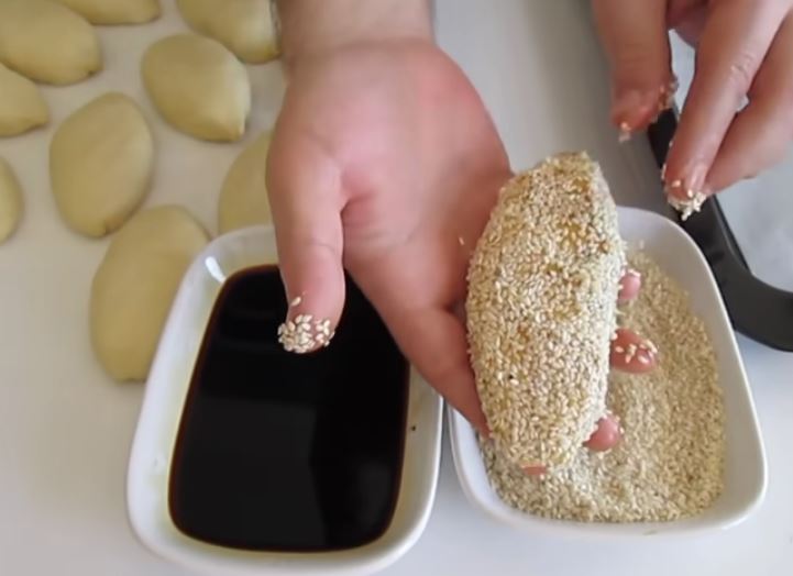 Παίρνω ένα-ένα κομμάτι και το πλάθω σε μπαλάκι. Στη συνέχεια, το πιέζω με τα δάχτυλα να πλατύνει. Βάζω στο κέντρο λίγο τριμμένο τυρί και διπλώνω τις άκρες για να κλείσει. Δίνω μακρόστενο σχήμα. Συνεχίζω την ίδια διαδικασία με όλα τα μπαλάκια.