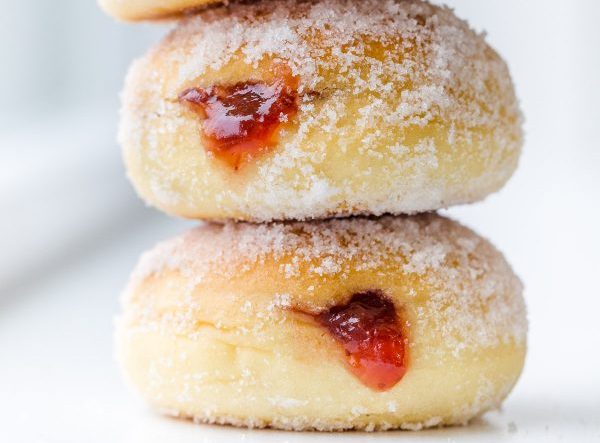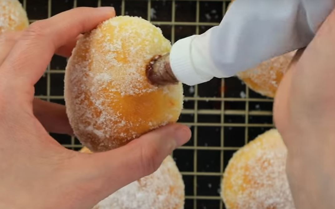 Κόψτε μια βαθιά σχισμή στην πλευρά κάθε ντόνατς και βάλτε μαρμελάδα με μια σακούλα ζαχαροπλαστικής.