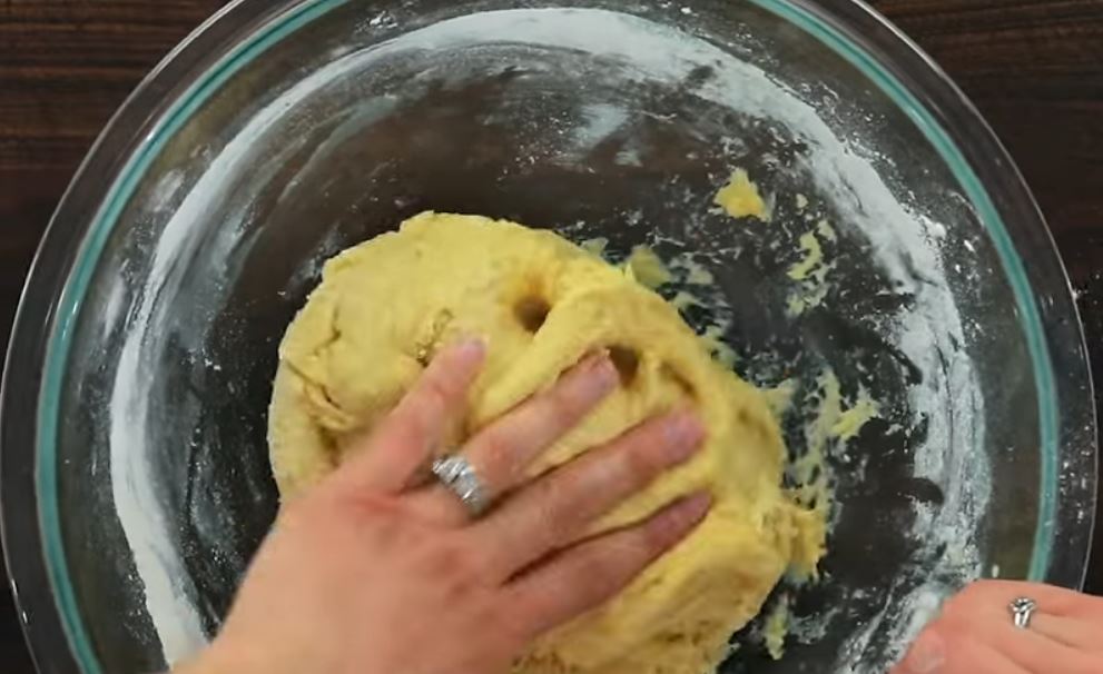 Προσθέστε τα υπόλοιπα 1 1/2 φλιτζάνι αλεύρι, προσθέτοντας αρκετή ποσότητα μέχρι να σφύξει η ζύμη και να μην κολλάει πλέον στις πλευρές του μπολ. Ζυμώστε στο μπολ 5 λεπτά. Αν η ζύμη κολλήσει πραγματικά στα χέρια σας, ρίξτε ελαφρά το αλεύρι και συνεχίζετε να ζυμώνεται .