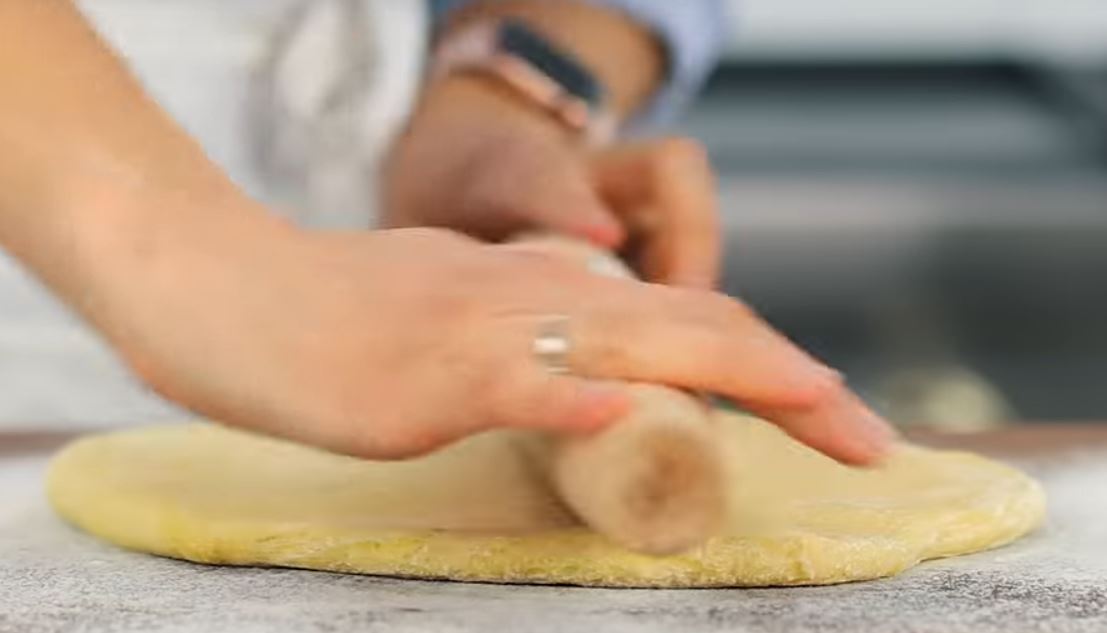 Γυρίστε τη ζύμη σε μια αλευρωμένη επιφάνεια και ανοιξτε τη ζύμη σε πάχος μόλις 1,2 εκ.