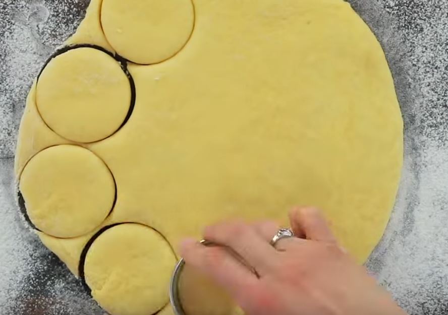 Κόψτε σε κύκλους χρησιμοποιώντας ένα στρογγυλό κόπτη μπισκότων περίπου 6,5 εκ. Φτιάξετε 12 ντόνατς συνολικά με όλη την ζύμη.