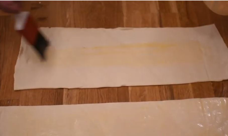 1)Κόβουμε το φύλλο σφολιάτας στην μεση και απλώνουμε με το πινέλο το Διάλυμα αυγού σε ολη την επιφάνεια.
