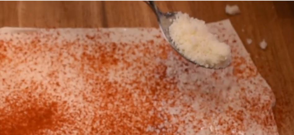 2)Στο ένα μισό φύλο ρίχνουμε την Πάπρικα και το τυρί.