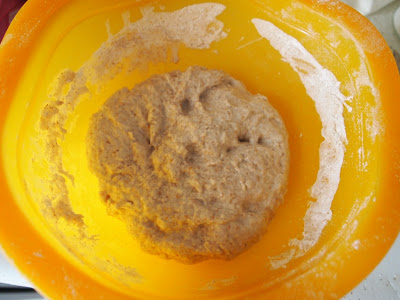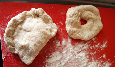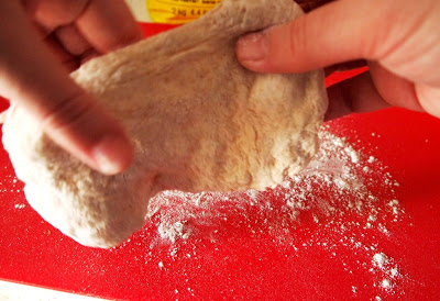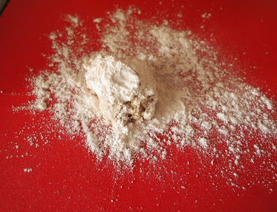 Αλευρώνουμε μια επιφάνεια (εγώ αλευρώνω πάντα μια επιφάνεια κοπής η οποία μετά πάει κατευθείαν για πλύσιμο και έτσι δεν λερώνω πάγκους) και αλευρώνουμε και τα χεράκια μας.