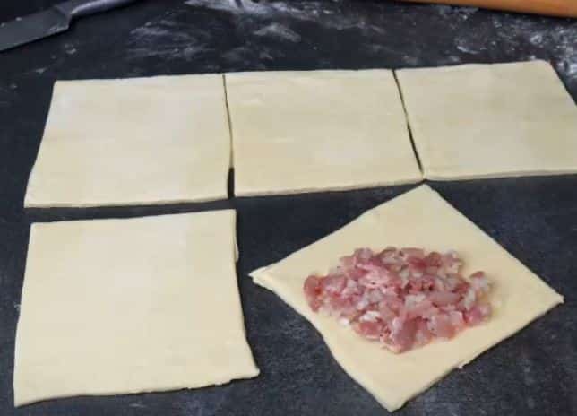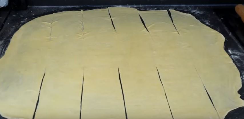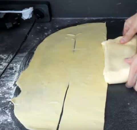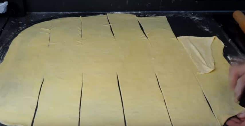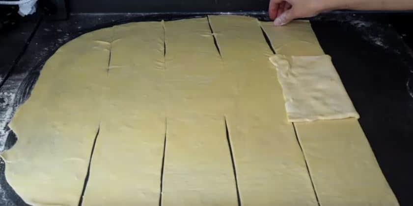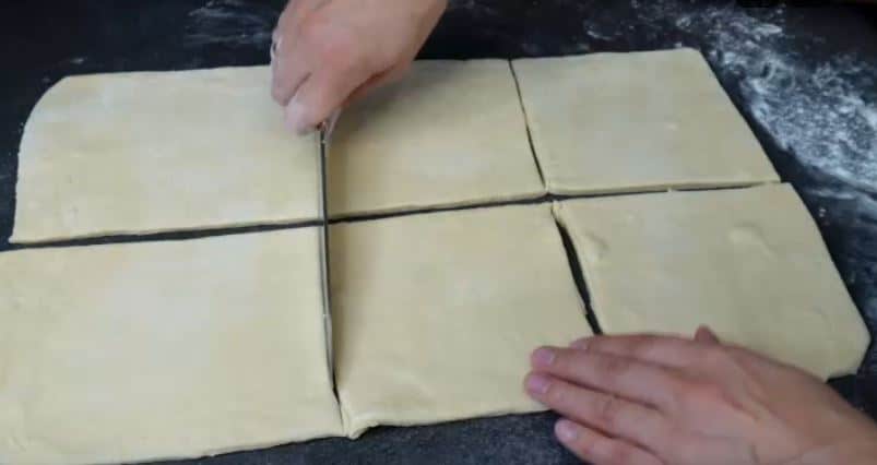 4. Πλάσιμο: Βγάζουμε τη ζύμη την ανοίγουμε σε ορθογώνιο και κόβουμε σε τετράγωνα κομμάτια