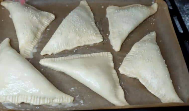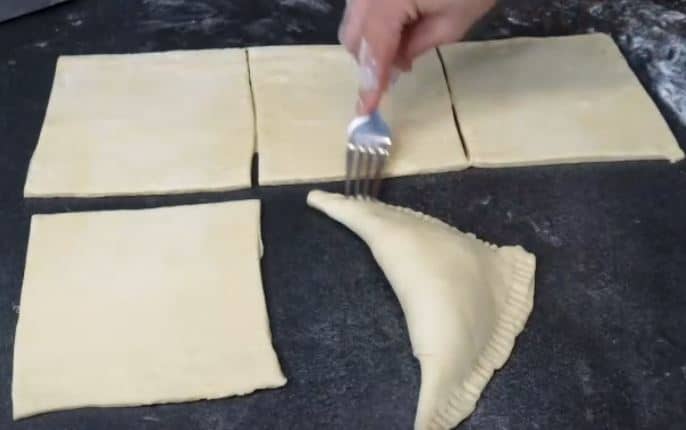 Τοποθετούμε τη γέμιση στο κέντρο και κλείνουμε σε τριγωνάκια πιέζοντας τις άκρες με ένα πιρούνι