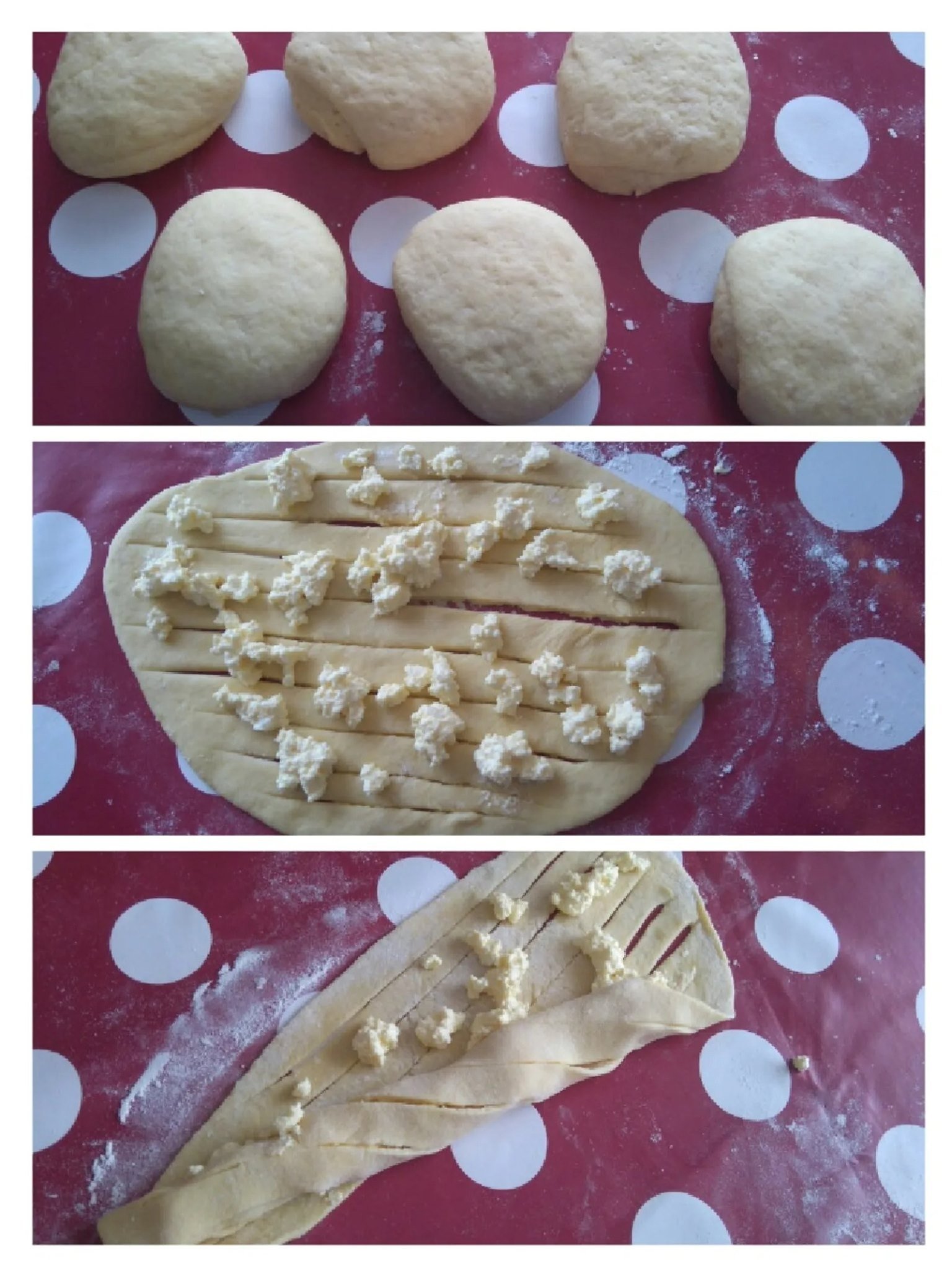 Μετά ανοίγουμε σε φύλλο με πάχος 3 χιλιοστά γεμίζουμε δίνουμε σχήμα που θέλουμε αλείφουμε με αυγό και ψήνουμε σε προθερμασμένο φούρνο σε ταψί με λαδόκολλα στους  180 ° με αέρα.