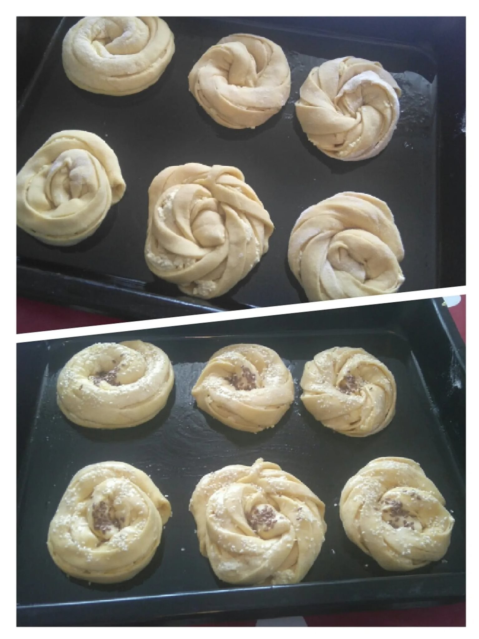 Τυλίγουμε τη ζύμη διαγώνια και, αν χρειάζεται, τη στρίβουμε λίγο ακόμα και την τυλίγουμε σε σχήμα σαλιγκαριού.