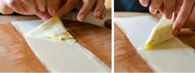 Βουρτσίστε με το μείγμα τα φύλλα (2 φύλλα τη φορά). Προσθέστε ένα κουταλάκι του γλυκού μείγμα τυριών και διπλώστε το από την μία γωνία στην άλλη σταυρωτα να φτιαξετε τα τρίγωνα.