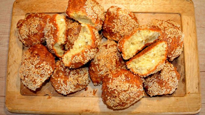 Με ένα πινέλο περνάμε όλα τα μπαλάκια από πάνω με το αυγό, στην συνέχεια τα βουτάμε στο σουσάμι και βάζουμε με την σειρά στο ταψί.