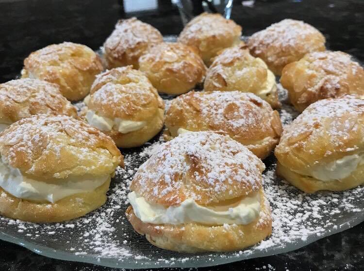 Με τη μύτη ενός μαχαιριού τρυπάμε τα σου ή τα κόβουμε στην μέση και τα γεμίζουμε με κρέμα που έχουμε βάλει στο κορνέ. Με προσοχή, βουτάμε τη μία πλευρά στη ζεστή καραμέλα και τα πασπαλίζουμε με τα καβουρδισμένα αμύγδαλα. Πασπάλισε με ζάχαρη άχνη και καλή απόλαυση!