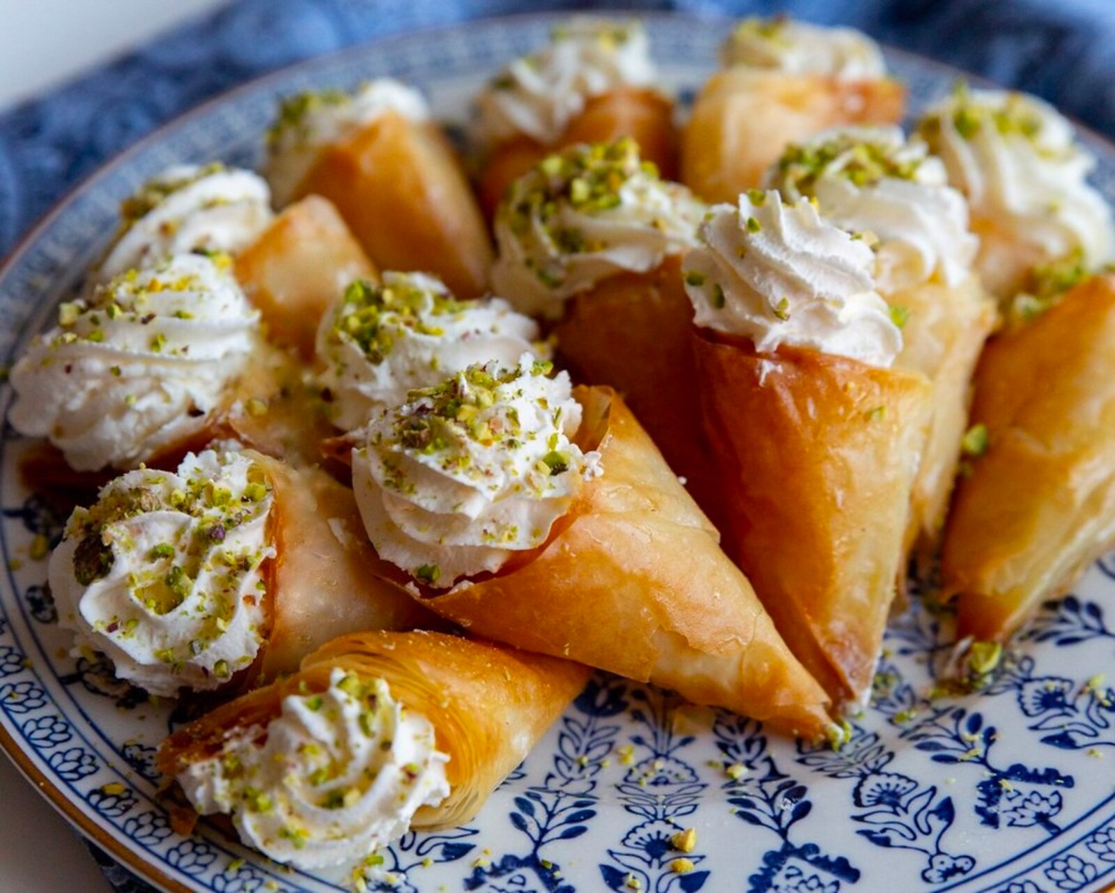 13. Χρησιμοποιώντας ένα κορνέ ζαχαροπλαστικής, γεμίστε τα τρίγωνα με κρέμα και γαρνίρετε ψιλοκομμένα καρύδια.