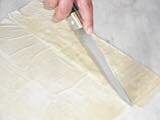 2. Ξετυλίξτε τη ζύμη κρούστας από το πλαστικό περίβλημα και τοποθετήστε την σε μια επιφάνεια εργασίας. Χρησιμοποιώντας ένα κοφτερό μαχαίρι κόψτε τα φύλλα σε τρεις λωρίδες (κόψτε τη μικρότερη πλευρά σε τρεις λωρίδες) και αφήστε τα στην άκρη. Τοποθετήστε ένα κομμάτι στην επιφάνεια εργασίας (κοντύτερη πλευρά να βλέπει προς εσάς) και ραντίστε με λιωμένο βούτυρο.