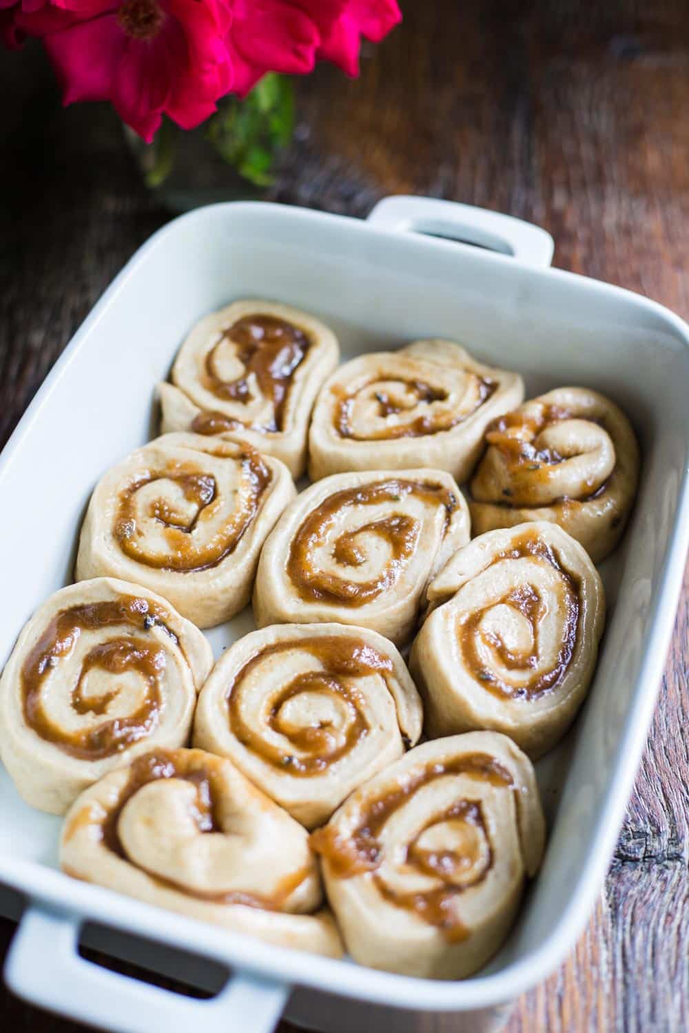 Σε ένα μεγάλο, λιπαρό ταψί, τοποθετήστε τους κυλίνδρους της ζύμης σε ίσες αποστάσεις. Αφήστε να καθίσετε για άλλα 45 λεπτά για να φουσκώσουν και πάλι.