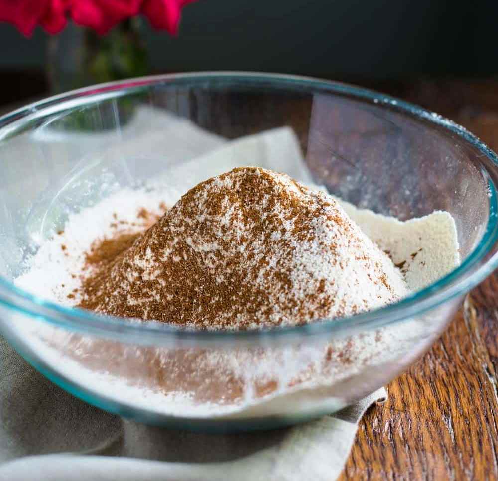 Σε ένα μεγάλο μπολ, κοσκινίστε μαζί τη ζάχαρη, το αλεύρι και την κανέλα.