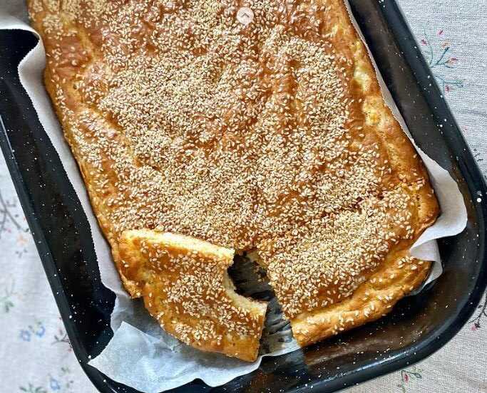 Τυριά: 300 γρ. φέτα χοντροσπασμένη & 100 γρ. τριμμένα διάφορα τυριά…ή μόνο φέτα Σουσάμι για πασπάλισμα!