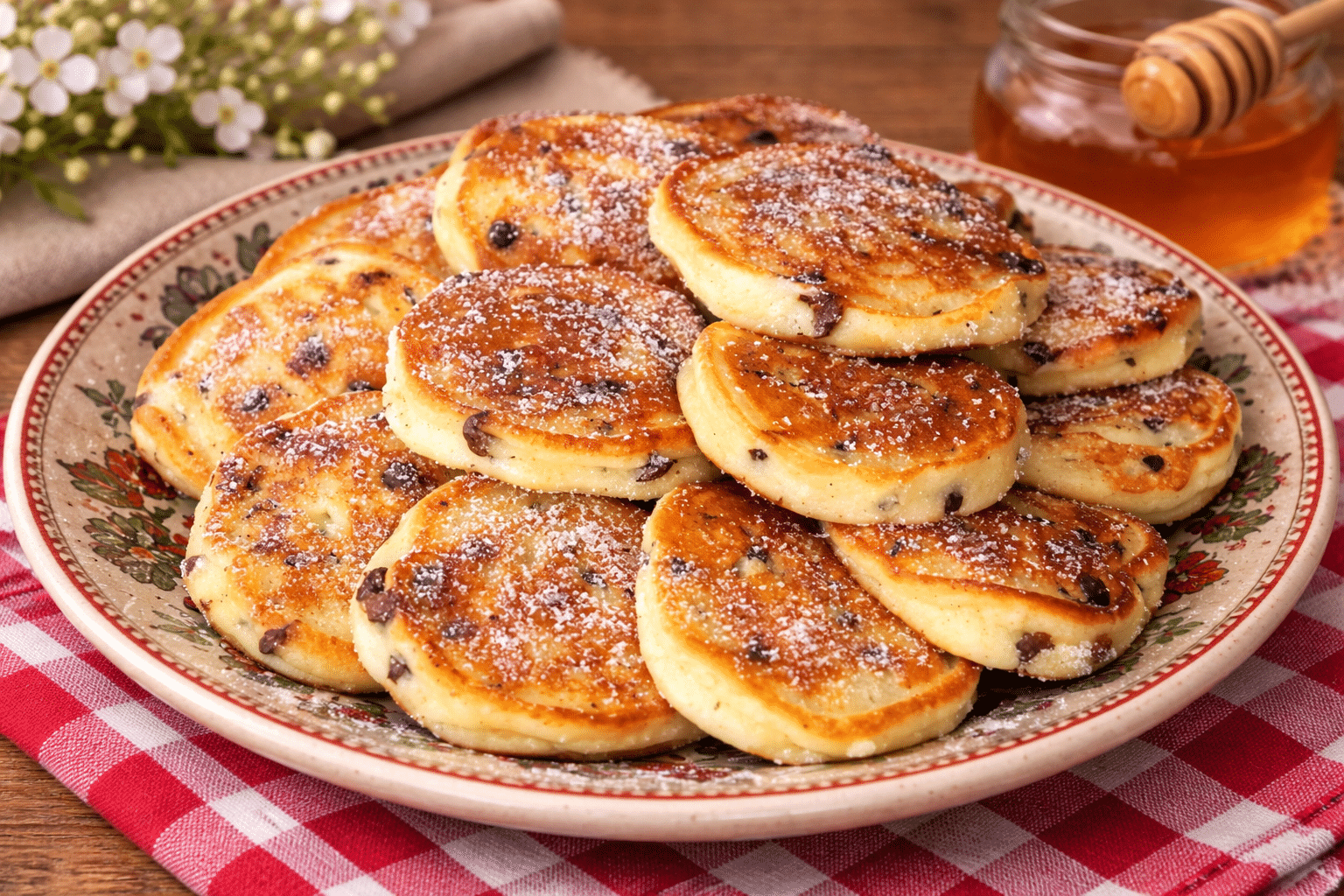 Μεταφέρουμε τη ζύμη σε ένα κορνέ ή χρησιμοποιούμε ένα κουτάλι για να βάλουμε μικρές δόσεις σε ένα ζεστό τηγάνι που έχουμε αλείψει ελαφρώς με λάδι.
