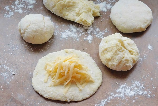 6. Πασπαλίστε την επιφάνεια εργασίας με αλεύρι, τρίψτε το τυρί σε τρίφτη. Διαχωρίστε από τη ζύμη ένα κομμάτι στο μέγεθος ενός αυγού, κυλίστετο λίγο σε αλεύρι και πιέστε στην κορυφή με την παλάμη σας για να σχηματίσετε έναν κύκλο. Τοποθετήστε μια μεγάλη πρέζα τριμμένου τυριού στο κέντρο.