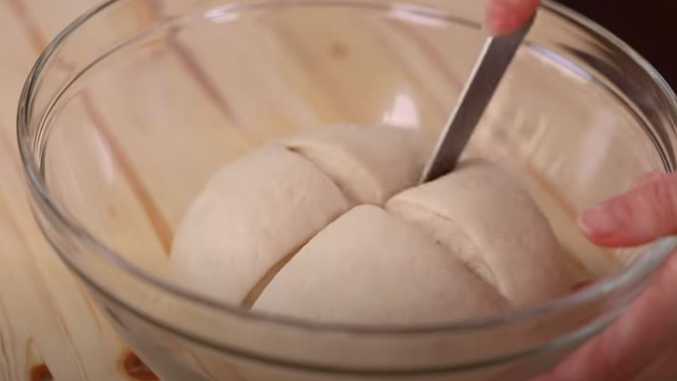 Τοποθετήστε τη ζύμη σε ένα μπολ, κόψτε την σταυρωτα απο πάνω,