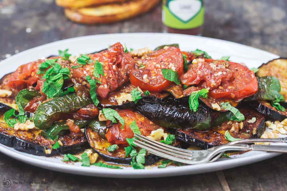 Πιάστε μια μεγάλη πιατέλα σερβιρίσματος, στρώστε λίγο τη μελιτζάνα στο κάτω μέρος, στη συνέχεια προσθέστε πράσινες πιπεριές και έπειτα τις σάλτσες ντομάτες από πάνω. Επαναλάβετε όπως απαιτείται έως ότου έχετε όλα τα λαχανικά στην πιατέλα σας. Γαρνίρουμε με ψύχα καρυδιού και ψιλοκομένο μαινταό ή δυοσμο.