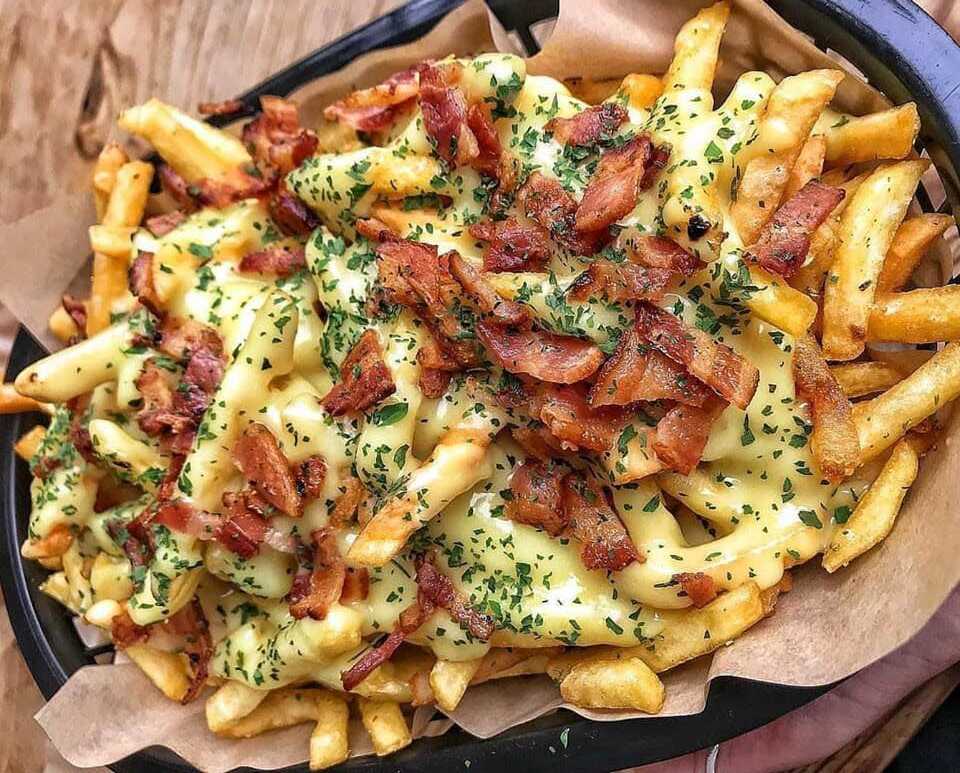 Τηγανητές Πατάτες με τυρί τσένταρ και μπέικον