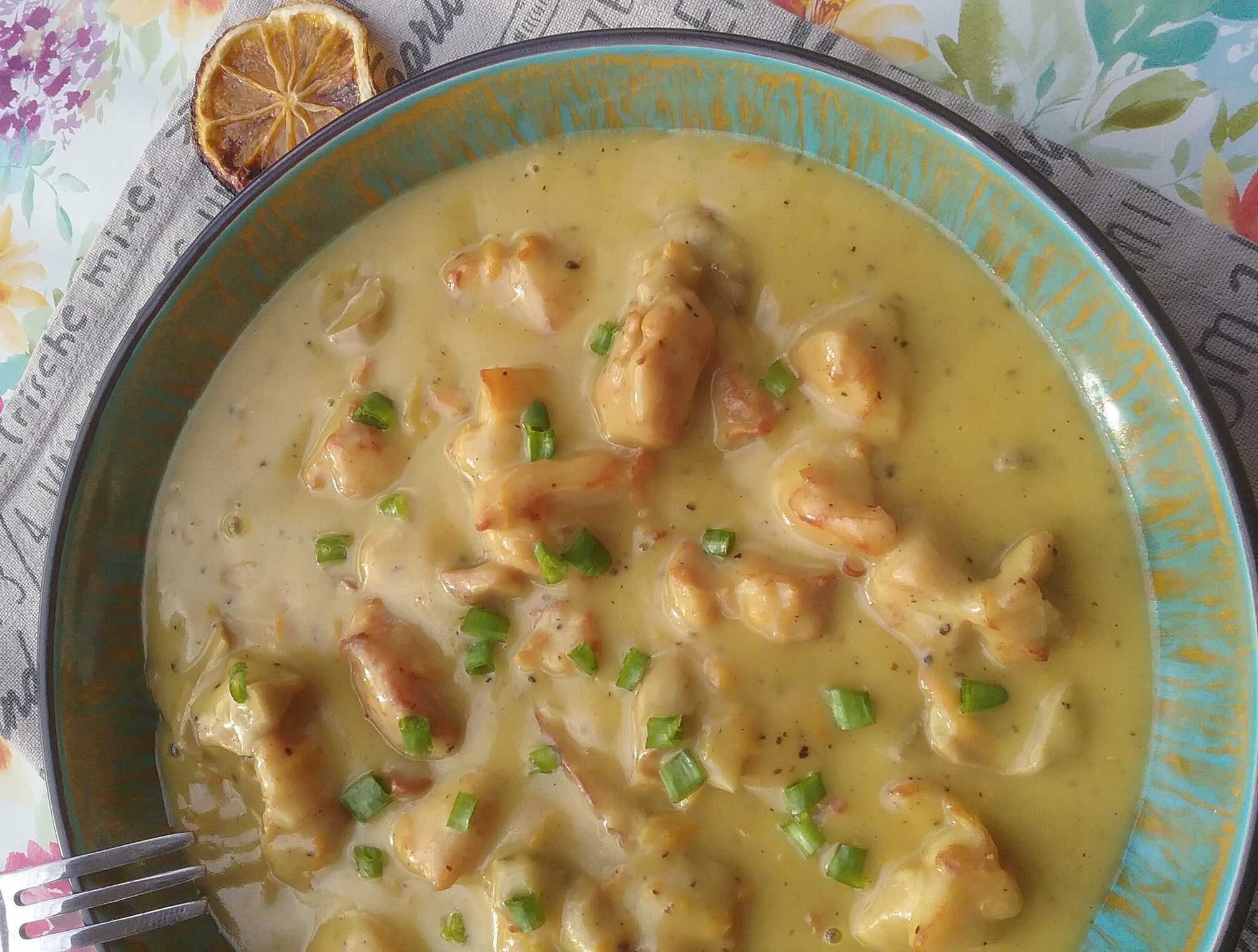 Τηγανητό κοτόπουλο με αρωματική βελούδινη σάλτσα με μανιτάρια και κάρυ.