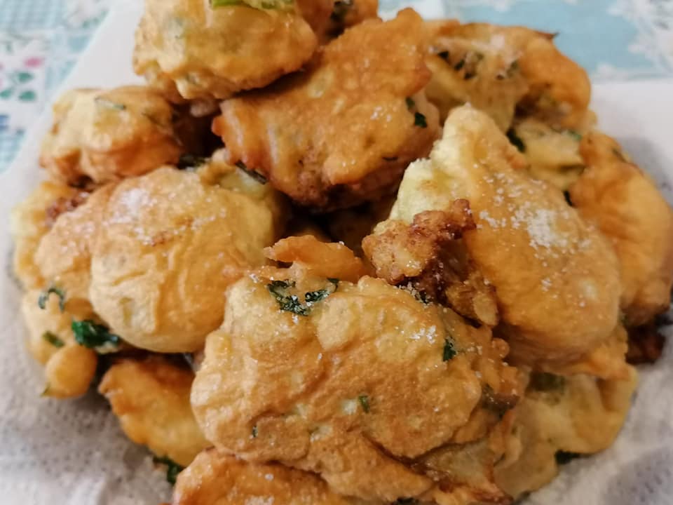 Αφού περάσει ο χρόνος, συνεχίζουμε να ανακατευουμε, ζεσταίνουμε το λάδι σε ένα τηγάνι και με τη βοήθεια δύο κουταλιών της σούπας τηγανίζουμε σε βραστό λάδι, όταν πάρουν ένα ανοιχτό χρυσαφί χρώμα, βγάζουμε και στραγγίζουμε σε πιατέλα στρωμένη με απορροφητικό χαρτί για λίγα λεπτά και μετά τα περνάμε σε ένα πιάτο σερβιρίσματος πασπαλίζουμε με