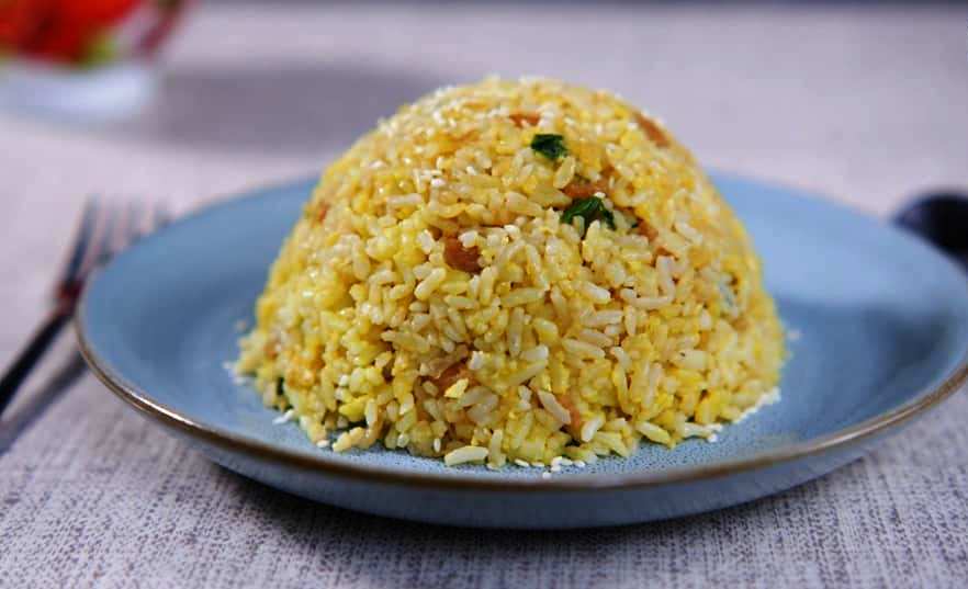 – Προσθέστε ρύζι ανακατεμένο με αυγά και τηγανίστε για 3 λεπτά ανακατεύοντας συνεχώς