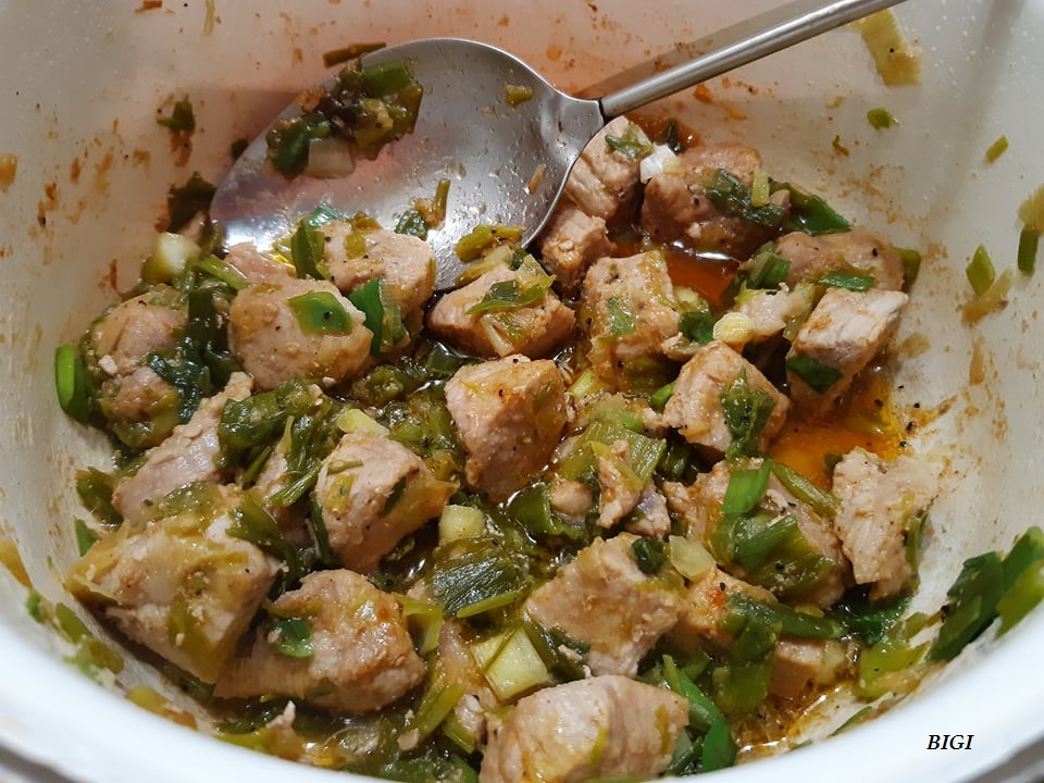 Ελέγξτε το κρέας για τρυφερότητα και γεύση. Όταν το κρέας είναι έτοιμο, προσθέτουμε το κρεμμύδι, το σκόρδο, ανακατεύουμε για άλλα δύο λεπτά.