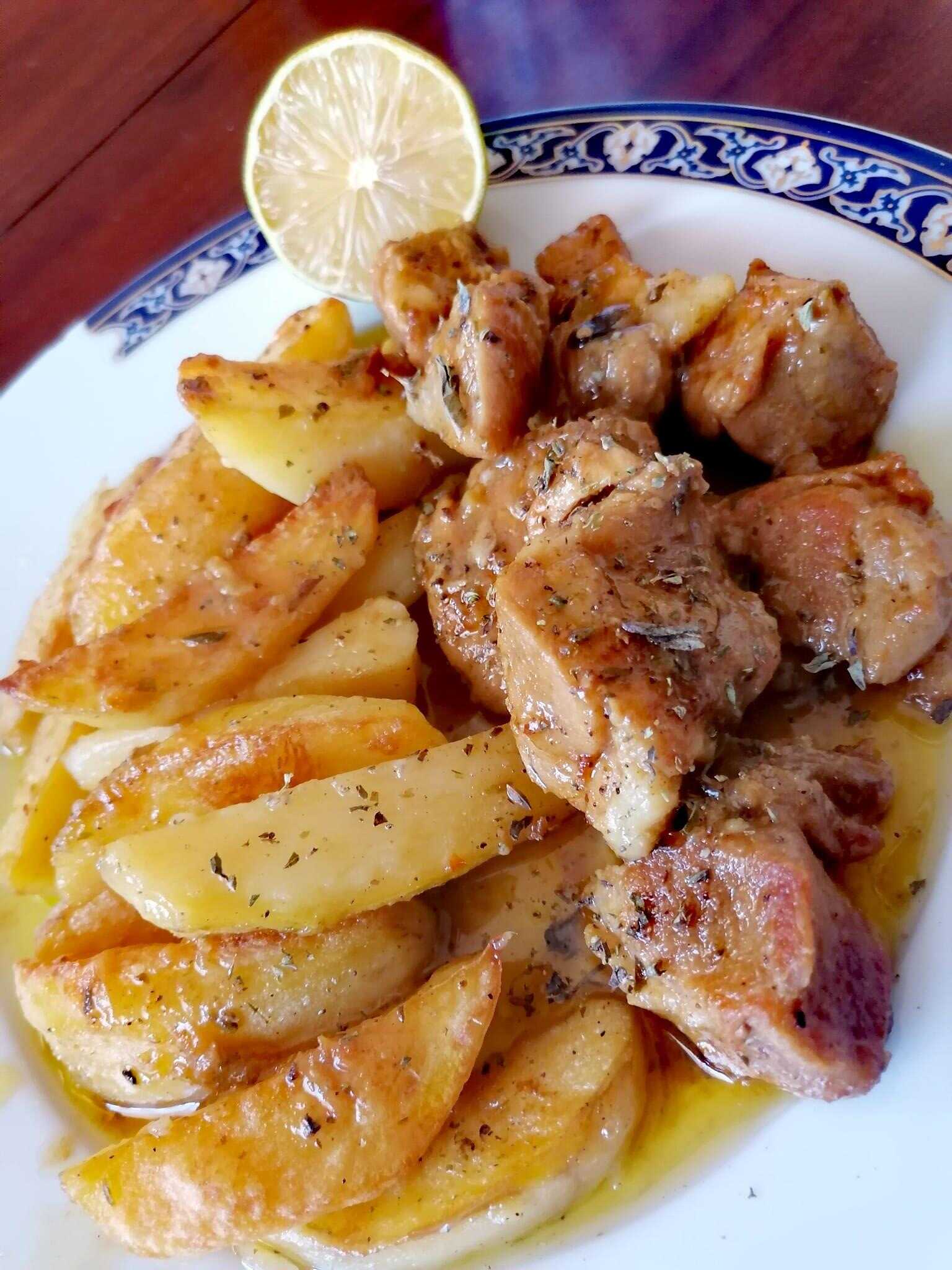 Εκοψα πατάτες κυδωνατες σε ταψάκι, αλατοπίπερο, σκόνη σκορδο, ελαιόλαδο κ τον υπόλοιπο ζωμό κ έψησα σε δυνατό φούρνο. ..