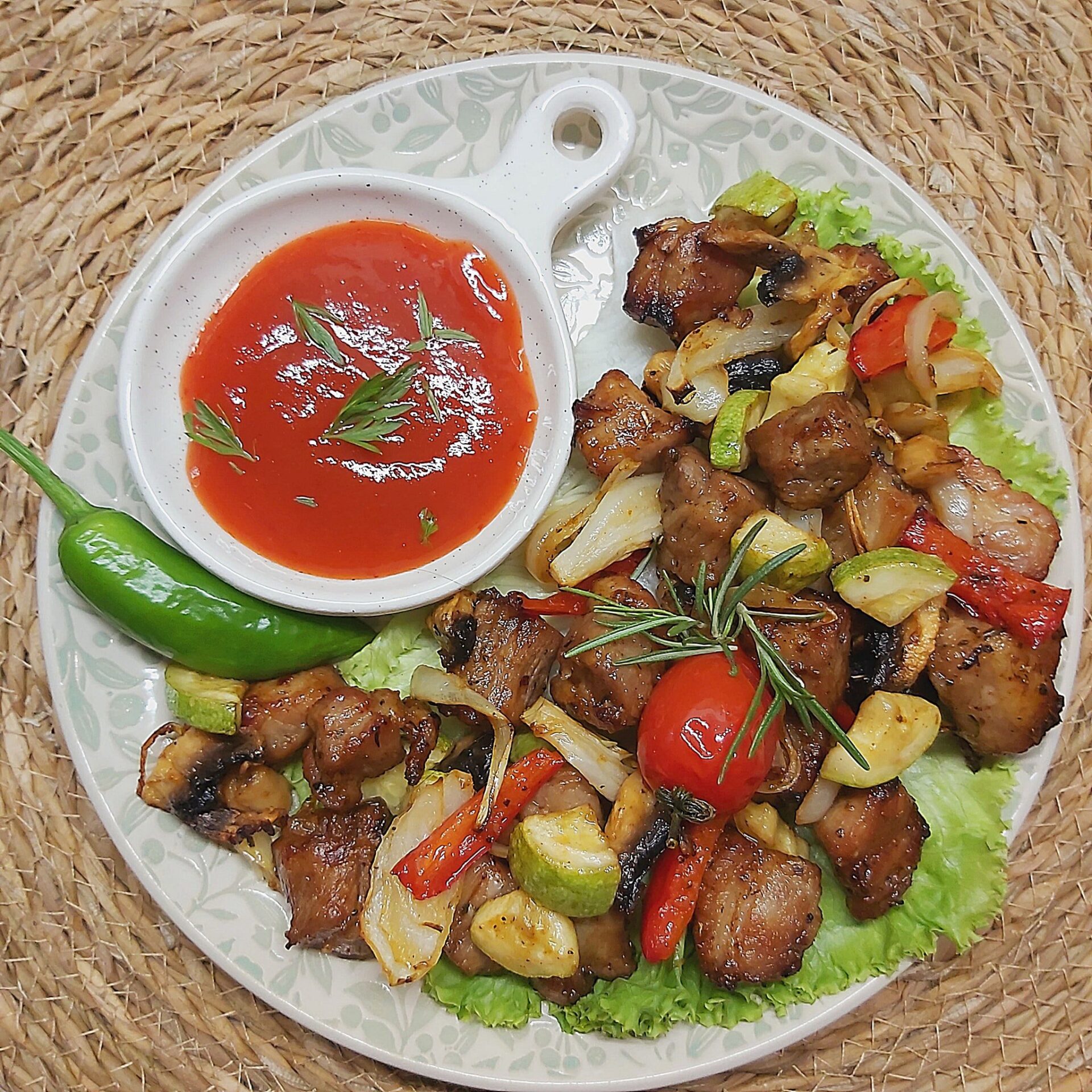 Το κρέας κόβεται σε κύβους, τοποθετούμε σε ένα μπολ και μαρινάρουμε με σάλτσα σόγιας, σάλτσα μπαρπεκιου, στυμμένο λεμόνι, λάδι, καπνιστή πάπρικα, για 20-30 λεπτά.
