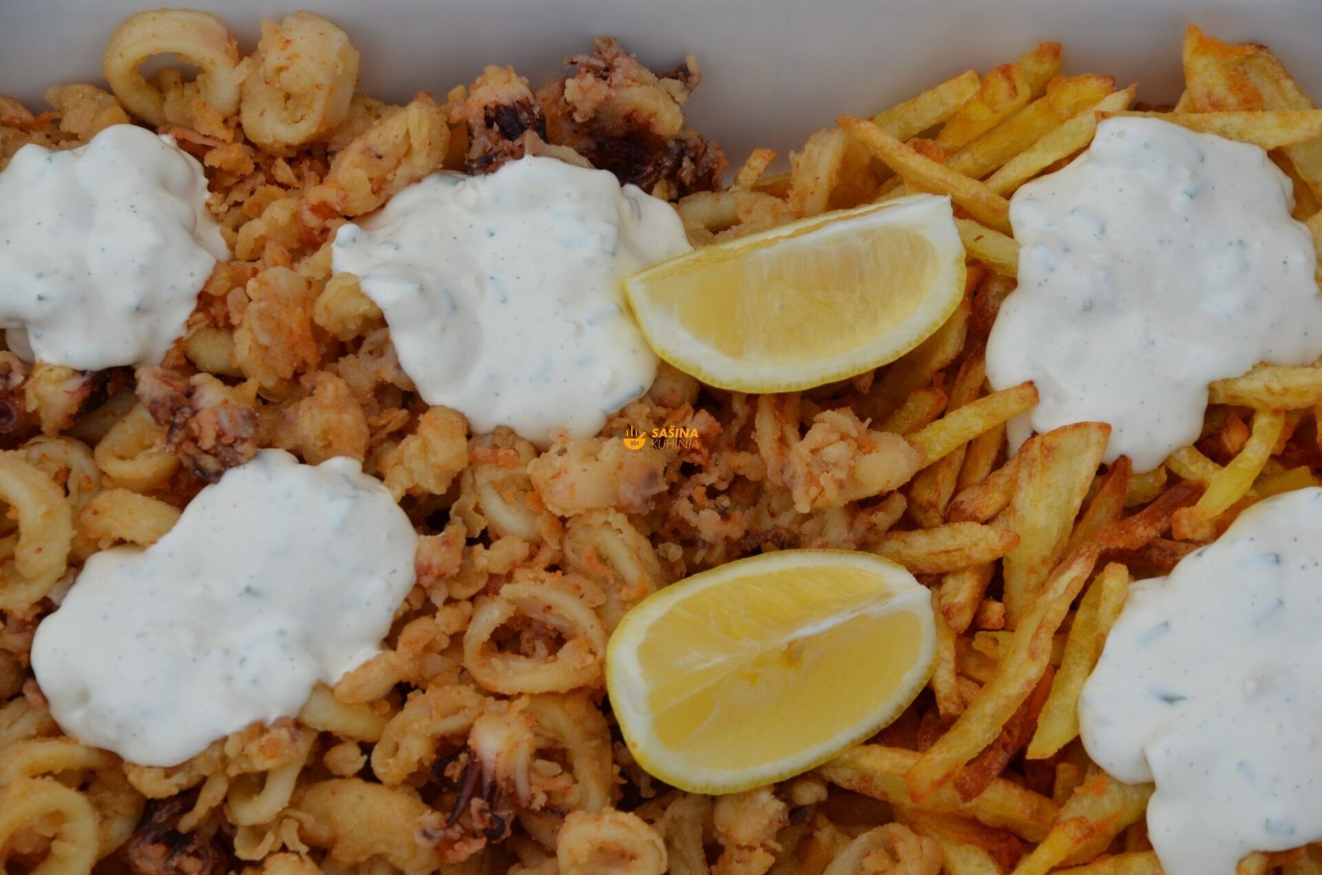Βγάζουμε την σάλτσα από το ψυγείο και βάζουμε κουταλιές πάνω απο τα καλαμαράκια και τις πατάτες. Διακοσμούμε με λεμόνι κομμένο στα 4.
