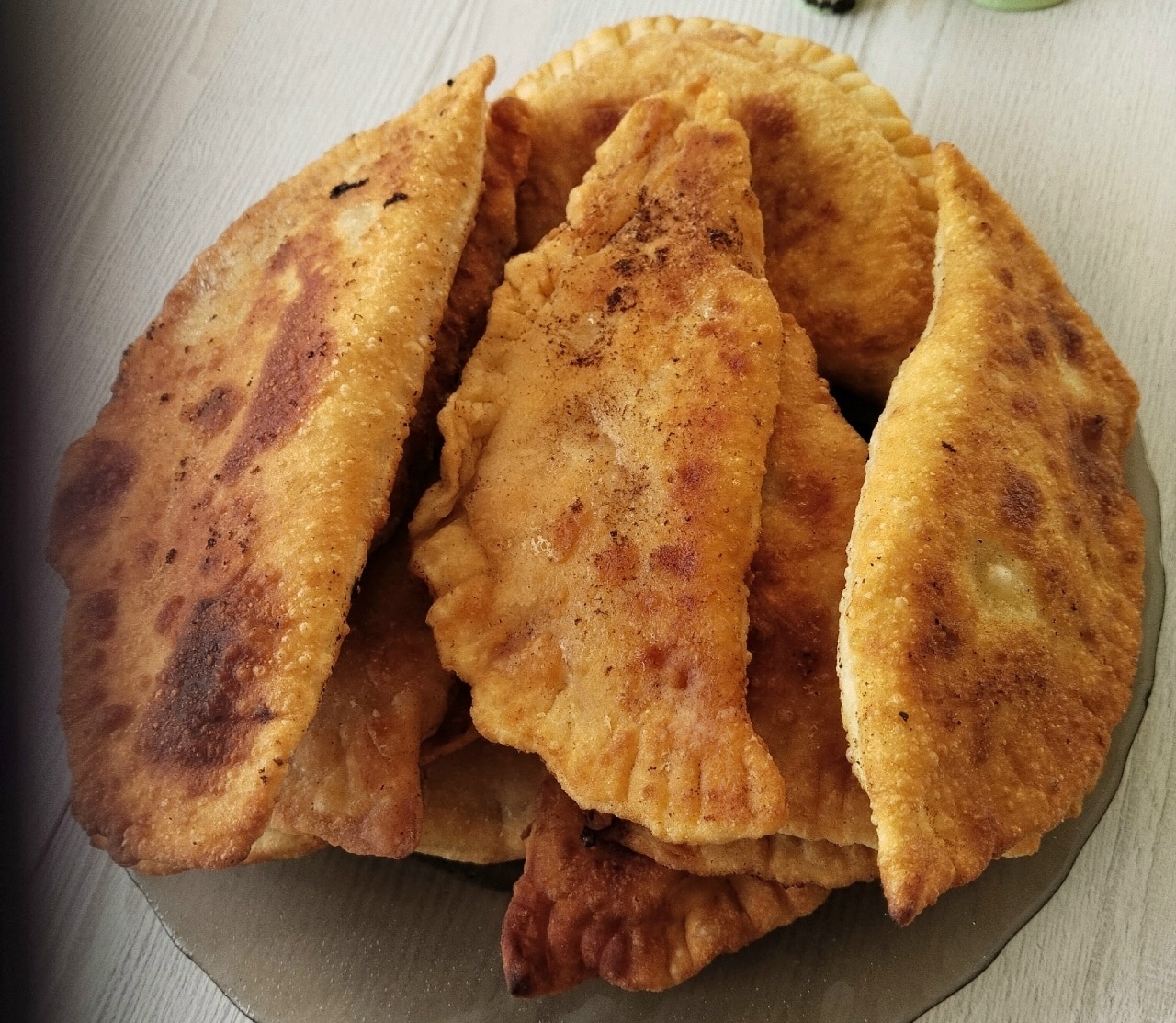 Διπλώνουμε τη ζύμη και κλείνουμε καλά τις άκρες πιέζοντας με τα δάχτυλά μας ή με πηρούνι. Τοποθετούμε τα τηγανιτά πιτάκια σε λαδόκολλα. Ζεσταίνουμε φυτικό λάδι σε ένα τηγάνι σε μέτρια φωτιά και τηγανίζουμε και από τις δύο πλευρές μέχρι να ροδίσουν και να γίνουν τραγανά.