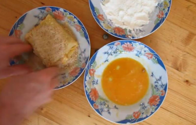 Πανάρουμε την κρέπα από το αλεύρι το αυγό και την φρυγανιά και αφήνουμε στην άκρη
