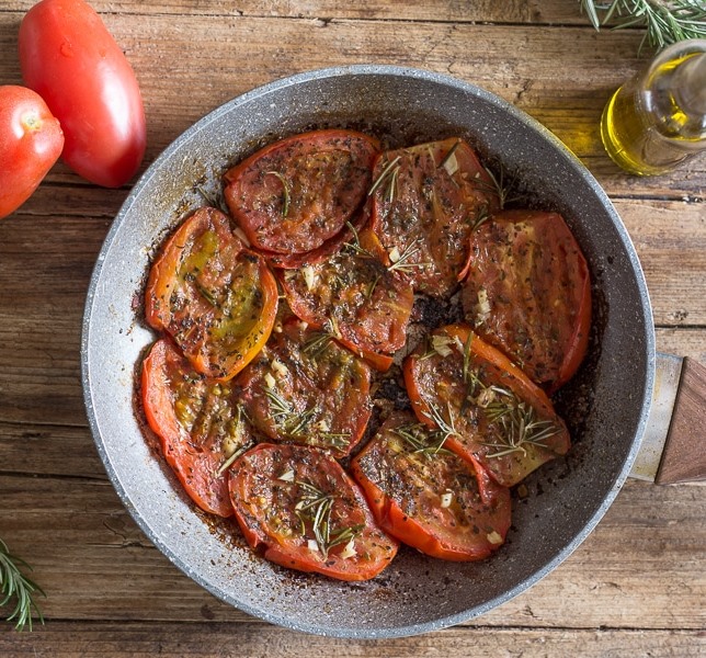 Καλύψτε και μαγειρέψτε σε μέτρια φωτιά για περίπου 10 λεπτά, αφαιρέστε το καπάκι και στραγγίστε τις ντομάτες με ένα πιρούνι, συνεχίστε να μαγειρεύετε ακάλυπτες μέχρι να εξατμιστεί όλη η υγρασία και μέχρι να ροδίσουν οι ντομάτες από κάτω (μου αρέσει να τις μαγειρεύω μέχρι να μαυρίσουν από κάτω). Πασπαλίζουμε με φρεσκοκομμένο βασιλικό και σερβίρουμε αμέσως.