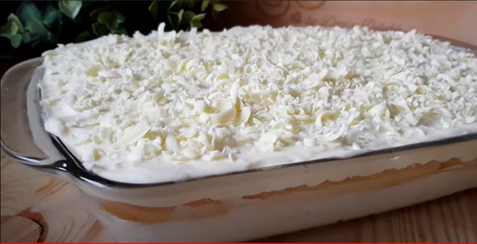 Από πάνω ασφαλίζουμε με τριμμένη σοκολάτα όλο το γλυκό και το βάζουμε στο ψυγείο για 3 ώρες και είναι έτοιμο