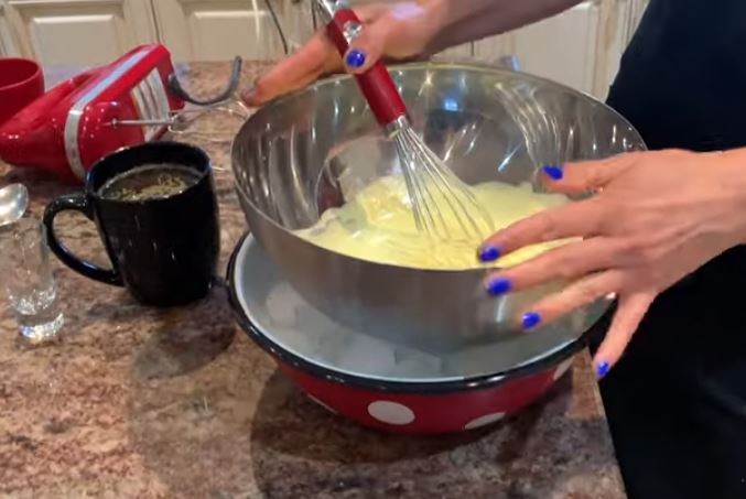 Αφαιρέστε το μπολ από την κατσαρόλα ενώ αναμειγνύετε τον κρόκο και το μείγμα ζάχαρης και τοποθετήστε το πάνω σε ένα άλλο μπολ στο οποίο έχετε βάλει παγάκια ώστε να κρυώσει.